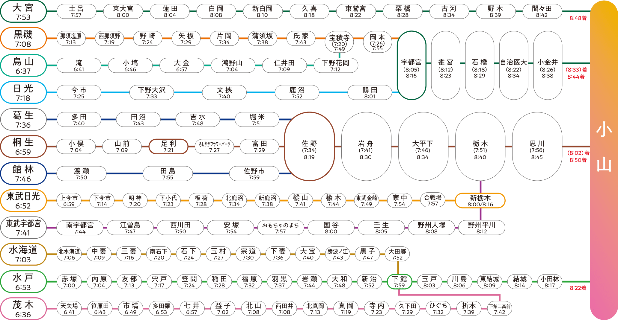 | 無料バス乗り場 | JR小山駅東口バス停 (黄色い腕章を付けた案内の者もおりますので、お声掛けください) |