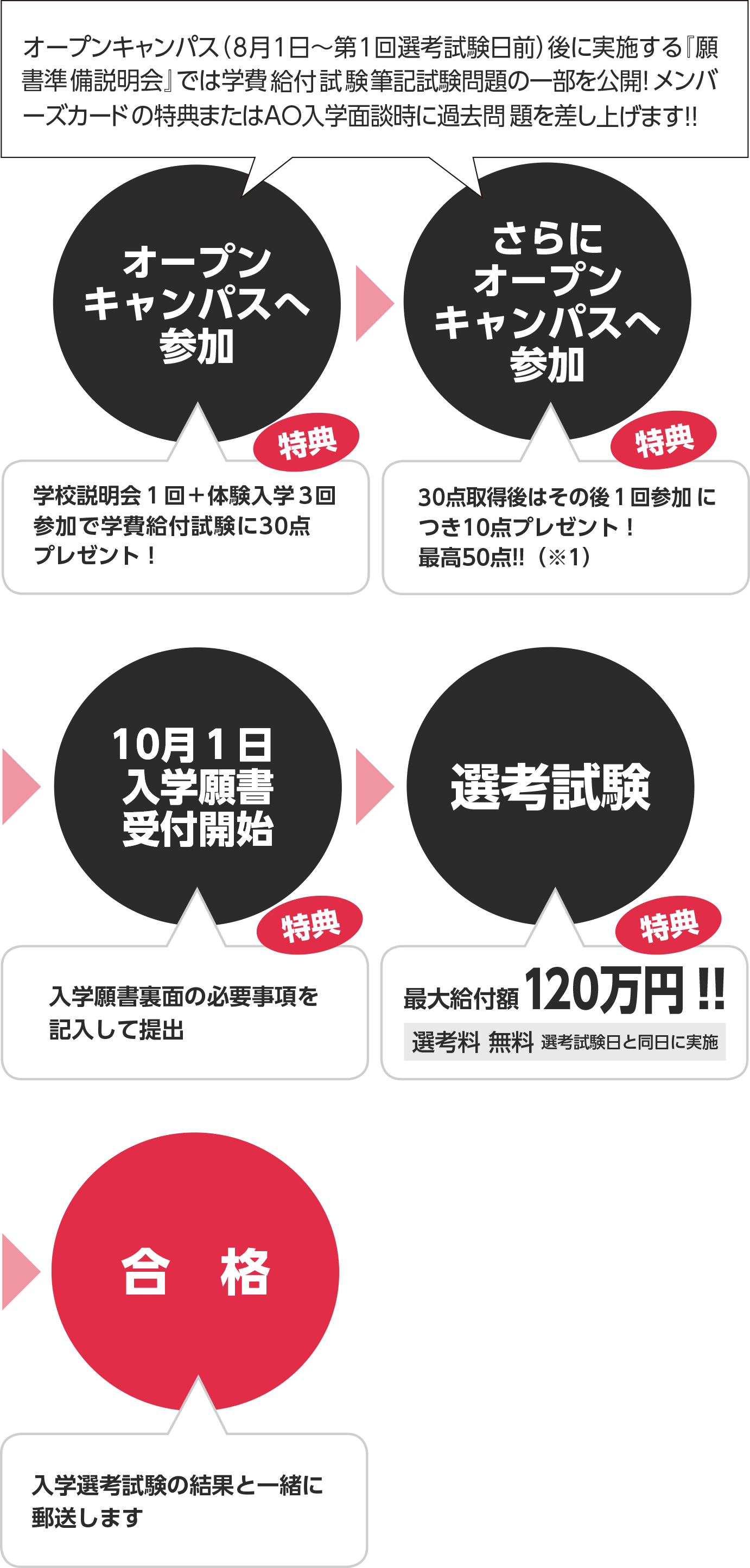 学校説明会1回+体験入学3回参加(第1回入試前まで対象)で30点プラス。その後は体験入学に1回参加する毎に、10点ずつプレゼント。(最大50点)