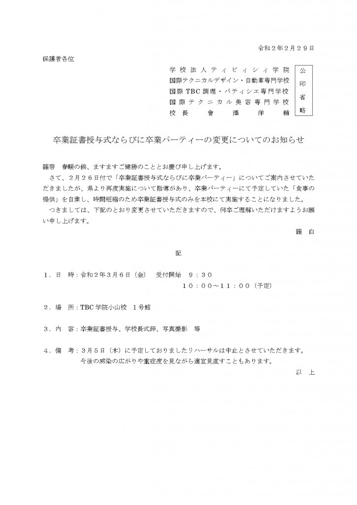 卒業証書授与式ならびに卒業パーティーの変更についてのお知らせ