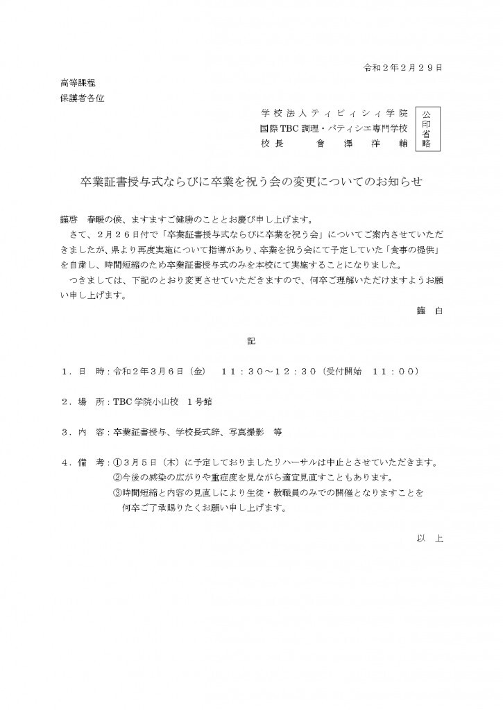 卒業証書ならびに卒業を祝う会の変更についてのお知らせ