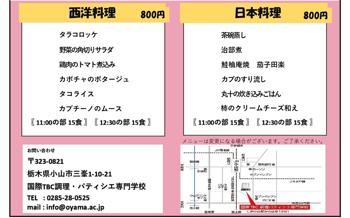 11:00からの部と12:30の部、今回はそれぞれ西洋料理コースと日本料理コースをご用意いたします!
