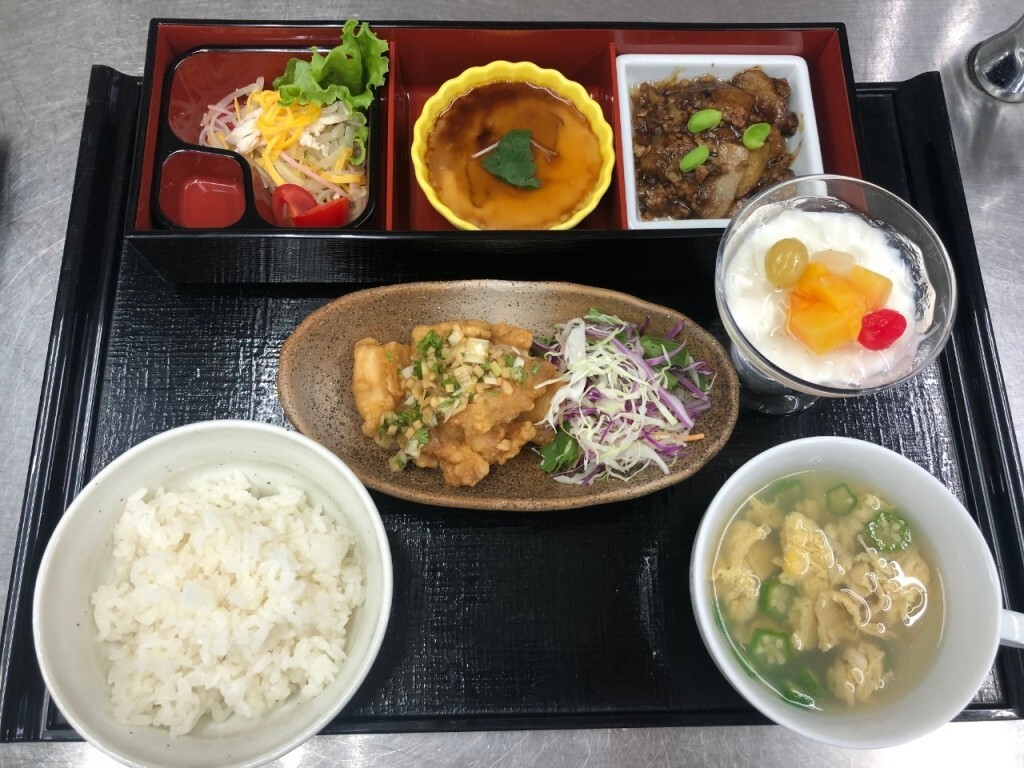 ・麻婆茄子 ・中国風和え物 ・茶碗蒸し ・玉子とオクラのスープ ・杏仁豆腐