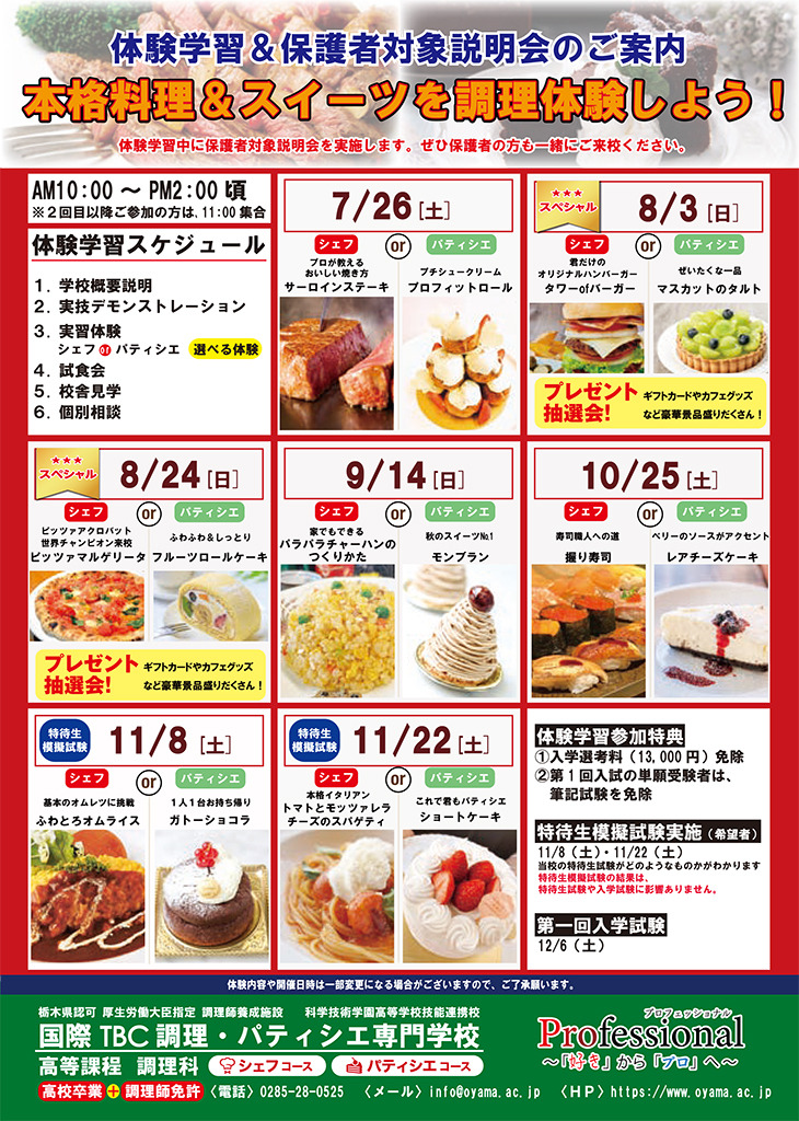 | 入学選考料(13,000円)免除 | 体験でもらったレシピを入れられるオリジナルレシピファイル | 高校生レストランあおはる無料ご招待券 | 美味際(模擬店)で使えるクーポン券 | 入学後の実習で使える氏名・学校名入りコックコート |