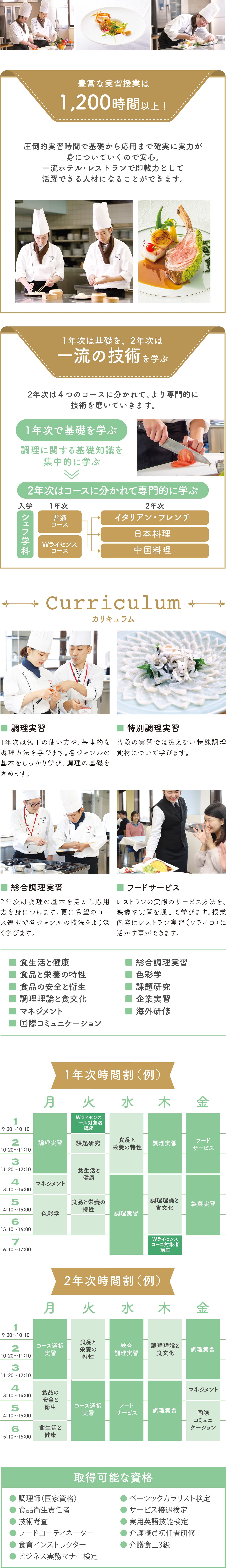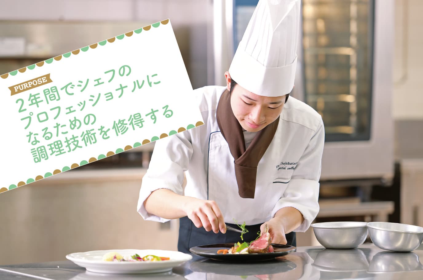 シェフ学科では、卒業時に調理師免許を取得可能。1 年次に全ジャンルの調理基礎技術を修得し、2年次に将来進みたいジャンル(西洋料理、日本料理、中国料理)を選び、専門性を極めていきます。さらに、調理師と製菓衛生師をダブルで取得できるダブルライセンスコースも設置。