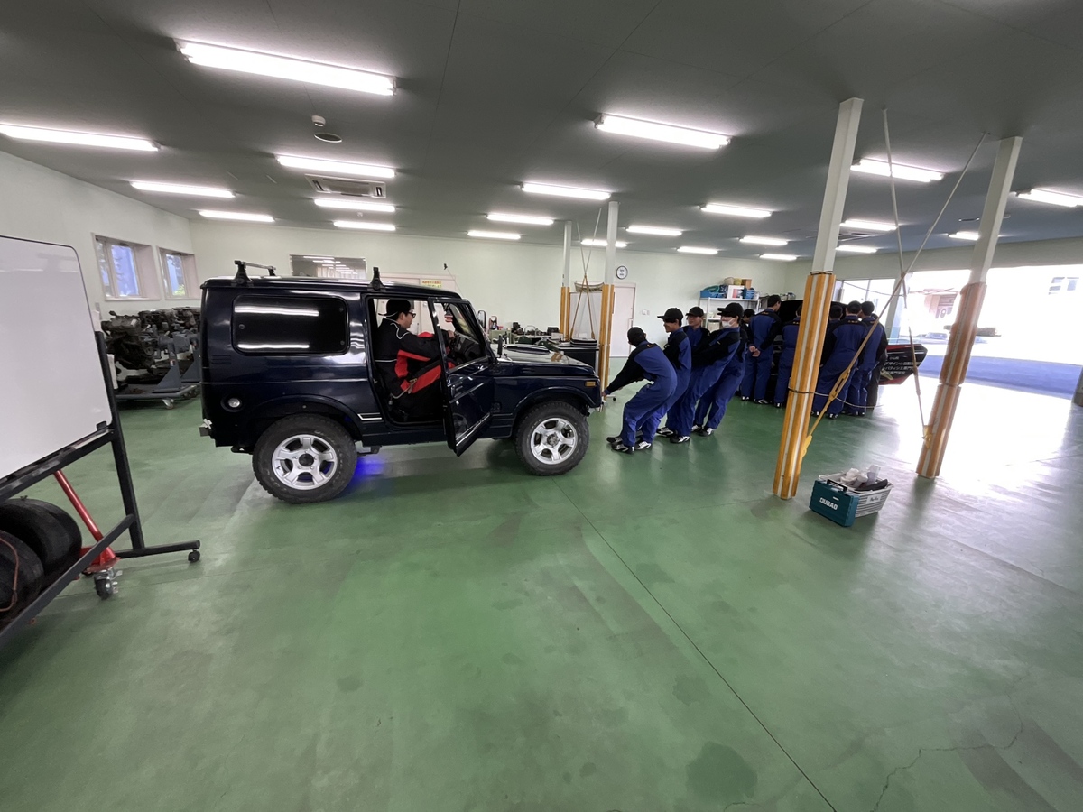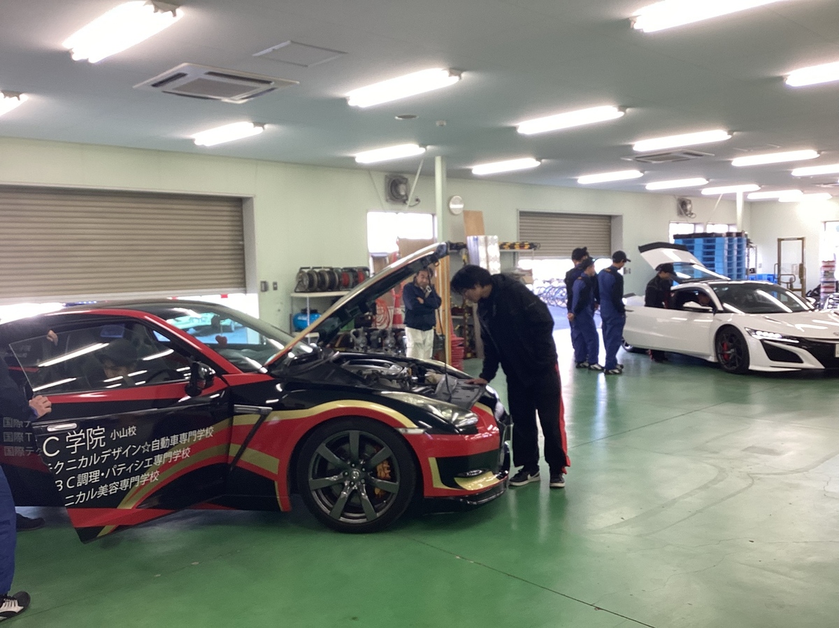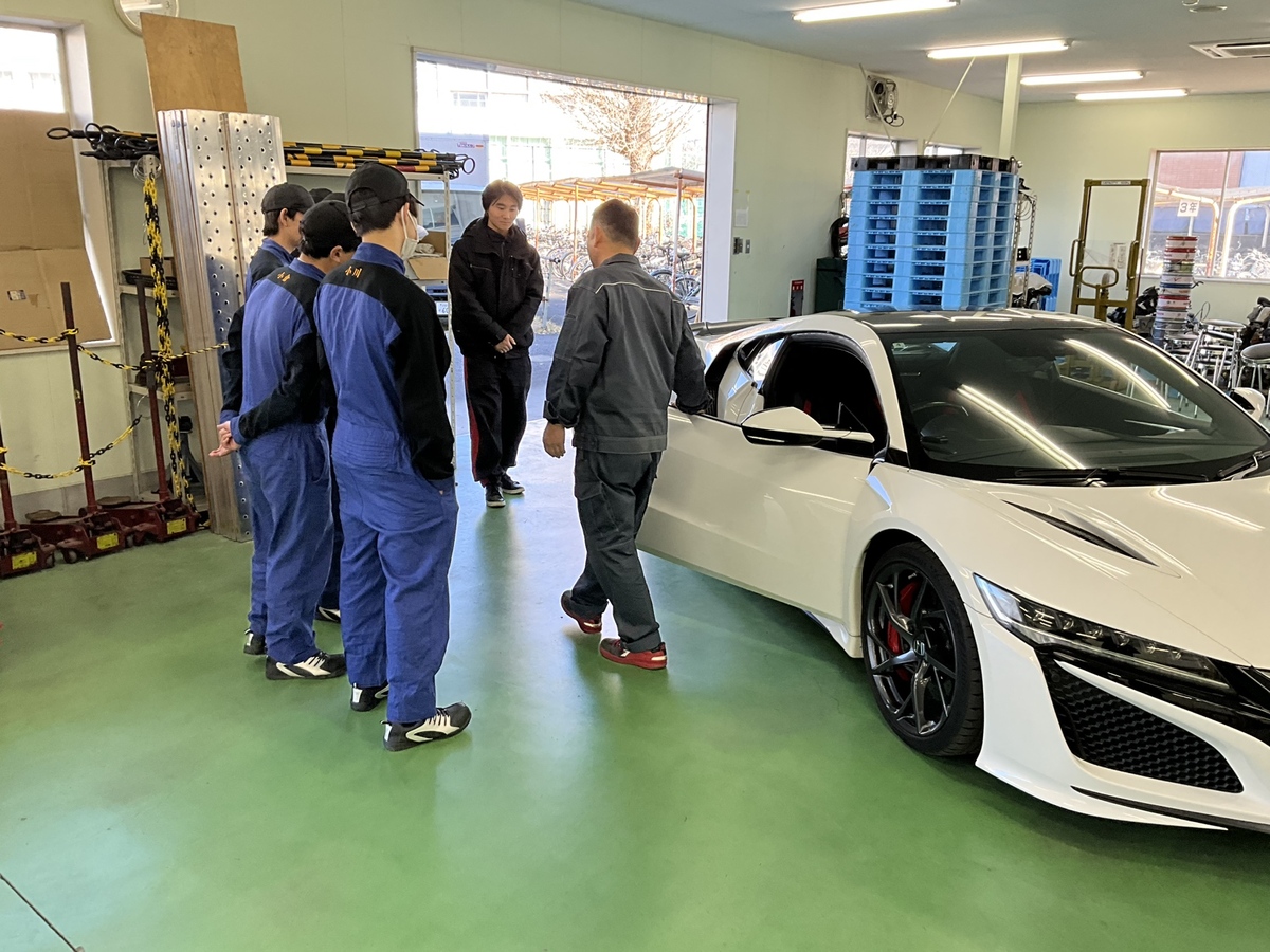 本校のホンダNSXと日産GTRそして本校学生のこだわりの車(ジムニー)の3台の特徴ある車を教材として、車に関する勉強をしていただきました????