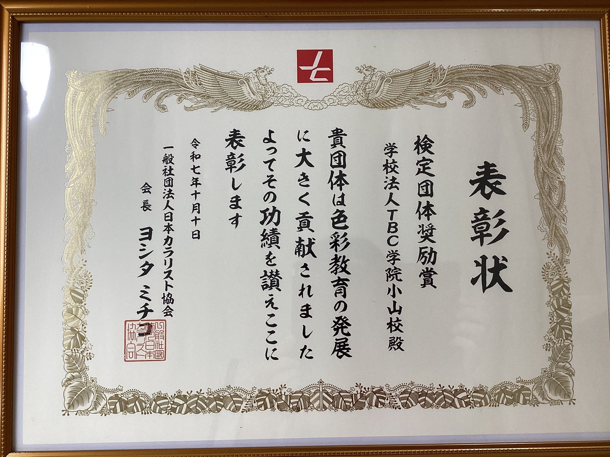イラスト・デザイン学科、シェフ学科、パティシエ学科、ブライダル・ホテル学科の学生が受験したパーソナルカラリスト検定において、当校が『検定優秀者育成団体賞』『検定団体奨励賞』を受賞し協会より表彰されました!