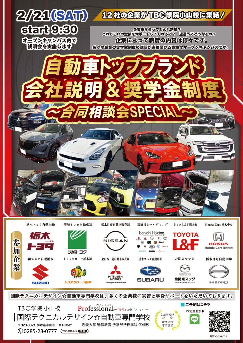 2月21日(土)のオープンキャンパスは「自動車トップブランド会社説明会&奨学金制度 合同相談会スペシャル」を開催!
